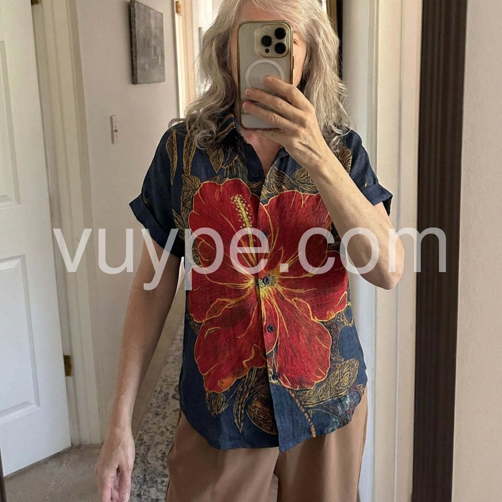 Channel island vibes with this Bold Tropical Hibiscus Print Top, a vibrant statement piece that brings the essence of paradise to your wardrobe. Crafted from lightweight, breathable fabric—likely cotton or linen blend—it features a rich navy base adorned with a striking oversized red hibiscus flower outlined in golden yellow, complemented by intricate leafy patterns throughout. The classic short-sleeve shirt design includes a relaxed fit, button-down front, and rolled sleeves for an effortless, laid-back look. Perfect for pairing with denim jeans, high-waisted shorts, or flowy skirts, this top is ideal for beach days, tropical getaways, or summer city strolls. Its bold floral motif exudes bohemian charm and exotic flair, making it a standout choice for those who love fashion with personality. Inspired by the playful, romantic styles found on sites like Lulus, this shirt effortlessly blends artistry and comfort—ideal for adding a splash of color and confidence to your warm-weather wardrobe.