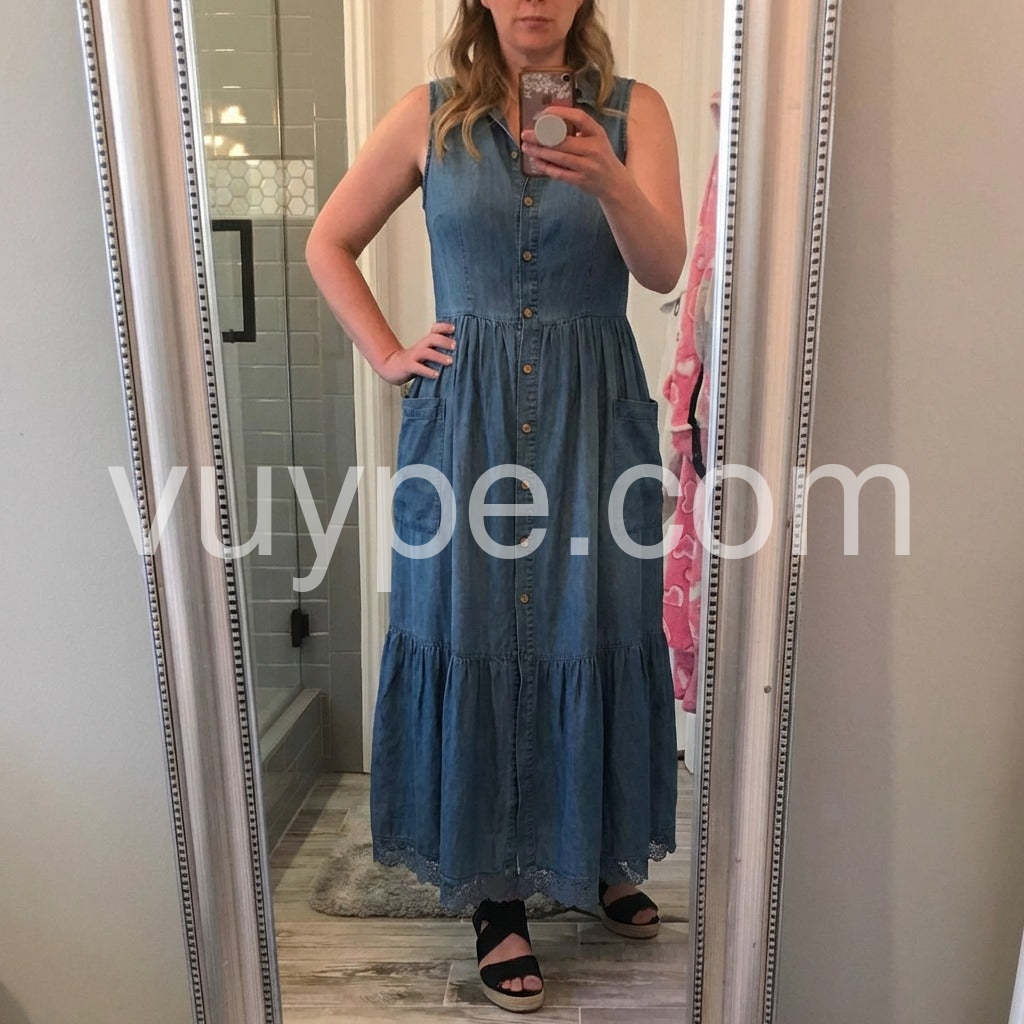 Crafted from premium denim, this sleeveless maxi dress combines timeless style with modern versatility. The flattering V-neckline and button-front closure create a refined silhouette that transitions effortlessly from casual daytime wear to evening occasions. The full-length cut offers elegant coverage while the structured denim fabric ensures durability and shape retention. Perfect for layering with jackets or cardigans, this wardrobe essential delivers both comfort and sophisticated appeal.