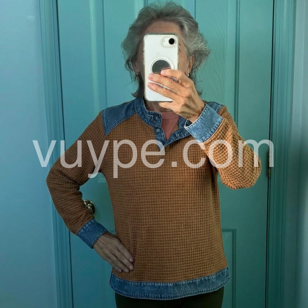 Crafted from premium denim, this long sleeve top features a sophisticated brown color block design that adds visual interest and versatility to your wardrobe. The structured fabric provides durability and maintains its shape through regular wear, while the extended sleeves offer practical coverage. The color blocking technique creates a modern silhouette that works seamlessly with both casual and elevated styling. Perfect for layering or wearing as a standalone piece, this top delivers timeless appeal with contemporary flair.