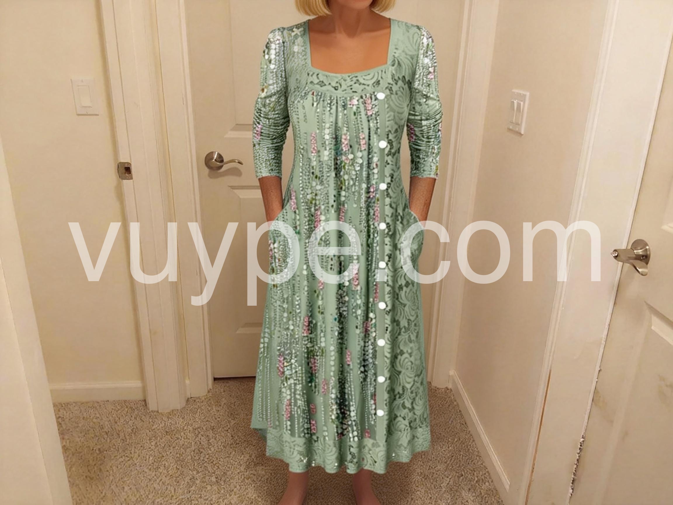 Imagine effortless elegance that turns heads at every glance. This fresh green midi dress captures modern sophistication with its architectural square neckline that frames the collarbone beautifully, paired with graceful long sleeves for refined polish. The A-line silhouette flows with understated grace, while the luxurious rayon-elastane blend moves like silk against your skin—stretchy enough for all-day comfort, yet structured enough to maintain its impeccable shape. Practical side pockets add a touch of everyday luxury, while the midi length strikes the perfect balance between timeless and contemporary. Whether you're navigating the office, attending weekend brunches, or stepping into evening plans, this dress adapts seamlessly to your lifestyle. Machine washable for effortless care. Discover the dress that makes you feel as good as you look.