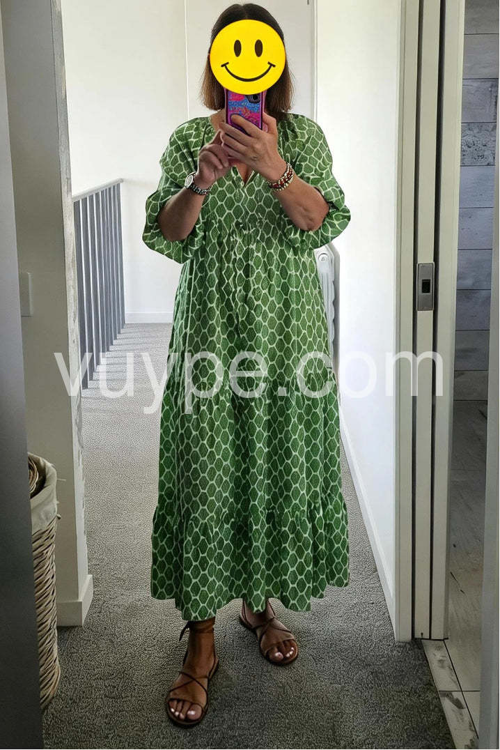 Get ready to turn heads everywhere you go in this above-the-ankle, vibrant green and white honeycomb print maxi dress! This laid-back and elegant dress is perfect for taking a stroll through your local farmer's market, making your way through a museum, or lunch with friends.