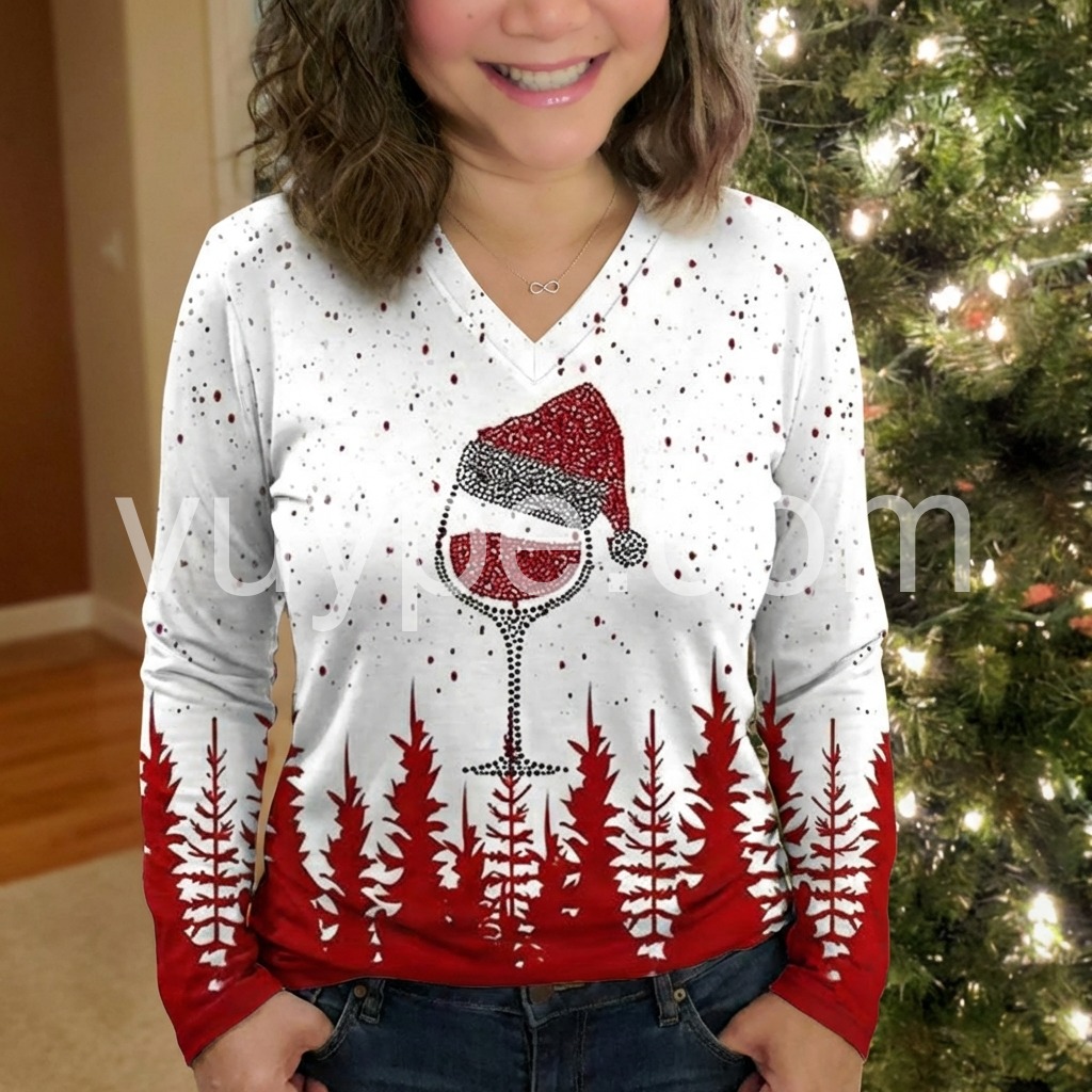 Spread holiday cheer with this long sleeve v-neck top! A dotted mosaic creates a tipsy red wine glass Santa Claus hat print, setting a fun and flirty mood for your next Christmas party. Red pine trees add the perfect backdrop for any time you need a joyful reminder of your favorite time of year.