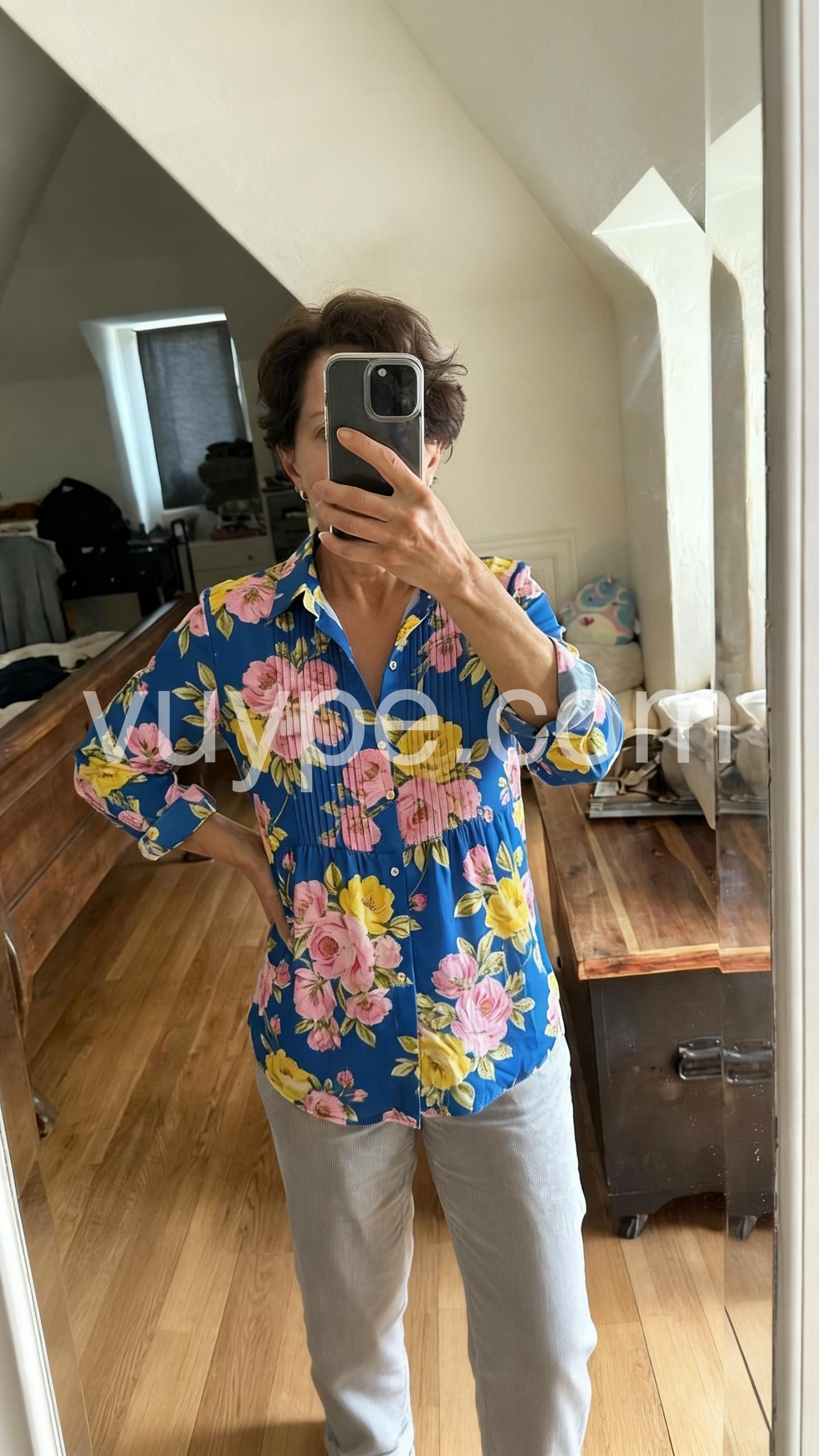 This long-sleeve button-up shirt features a vibrant blue base with large pink and yellow floral prints. The pleated front adds texture and flair. Perfect for casual or semi-formal spring/summer looks. Pair with jeans for a stylish, relaxed outfit. Lightweight and breathable fabric.
