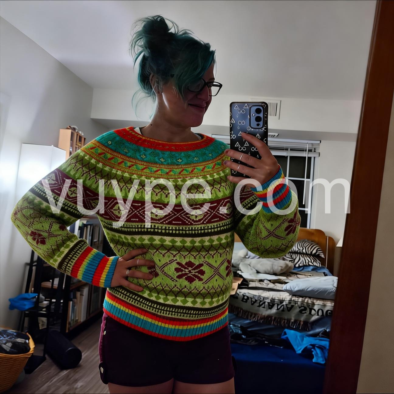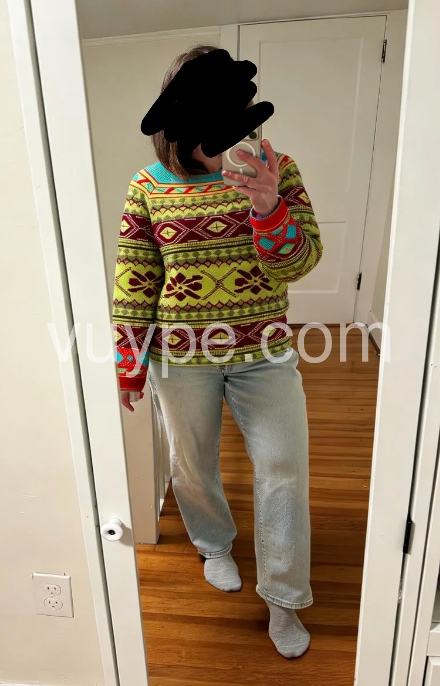 This sweater is such a fun and vibrant addition to my wardrobe! The mix of bright lime green, deep burgundy, and pops of turquoise in the classic fair isle pattern is so eye-catching—you can’t help but smile when you put it on.