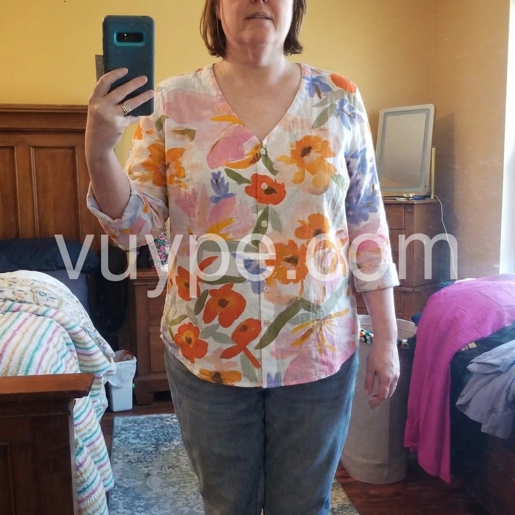 This long-sleeve blouse features a vibrant watercolor floral print in soft pinks, oranges, and blues. The V-neck and button-down front add a classic touch. Lightweight fabric perfect for spring and summer. Pair with jeans or skirts for a fresh, casual look. Effortlessly stylish and comfortable.