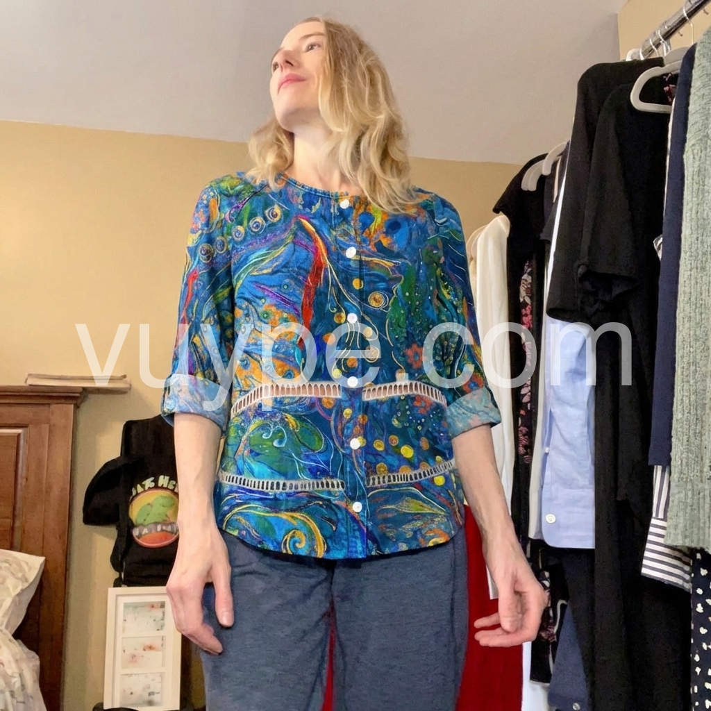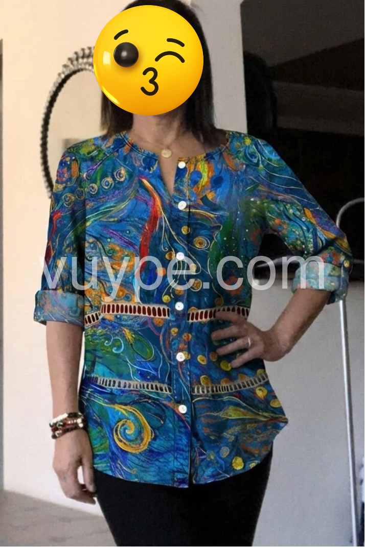 This long-sleeve button-up top features a bold blue base with colorful abstract patterns. The relaxed fit and rolled sleeves add comfort and style. Perfect for casual wear or bohemian outfits. Pair with jeans or leggings for effortless flair. Lightweight fabric ideal for warm days.