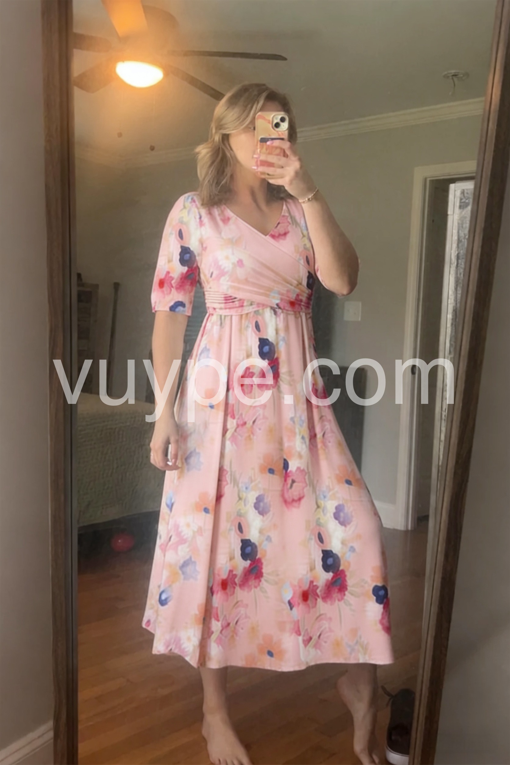 This midi dress features a soft pink base with vibrant floral prints. The V-neck and short sleeves offer a feminine touch. Side pockets add practicality and ease. Lightweight fabric perfect for spring or summer days. Ideal for casual outings or garden parties.