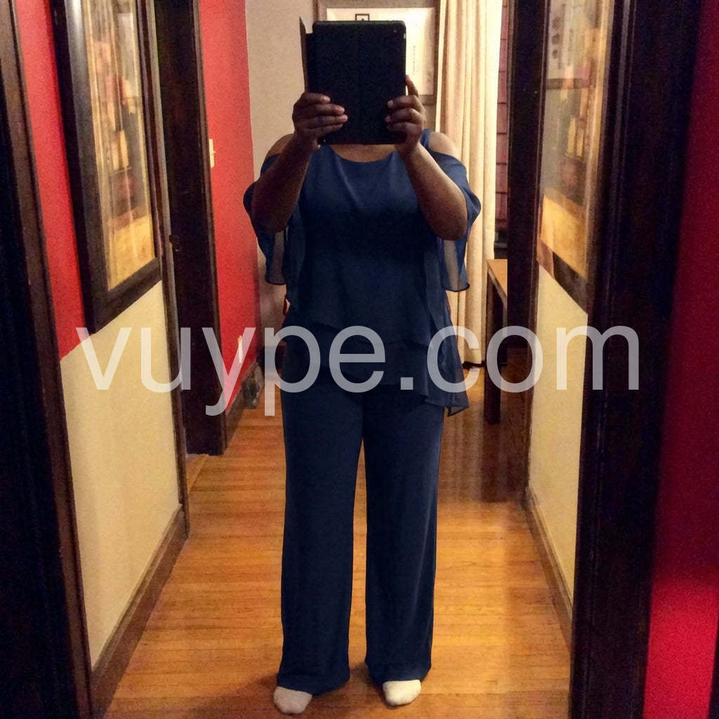 This fashionable two-piece set includes a navy cold shoulder three-quarter length draped sleeves and asymmetrically layered ruffled top and pants. Crafted from lightweight and soft materials, this set is perfect for any occasion. Step up your look with this stylish set.