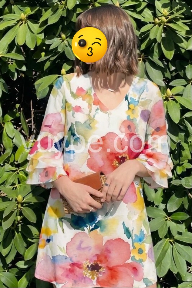 This floral dress features a soft watercolor print with vibrant pink, red, and blue blooms on a light background. The V-neckline and flared sleeves add a romantic touch. Loose, relaxed fit ensures comfort and ease. Perfect for spring outings, brunches, or beach days. Lightweight fabric flows beautifully for a breezy, effortless look.