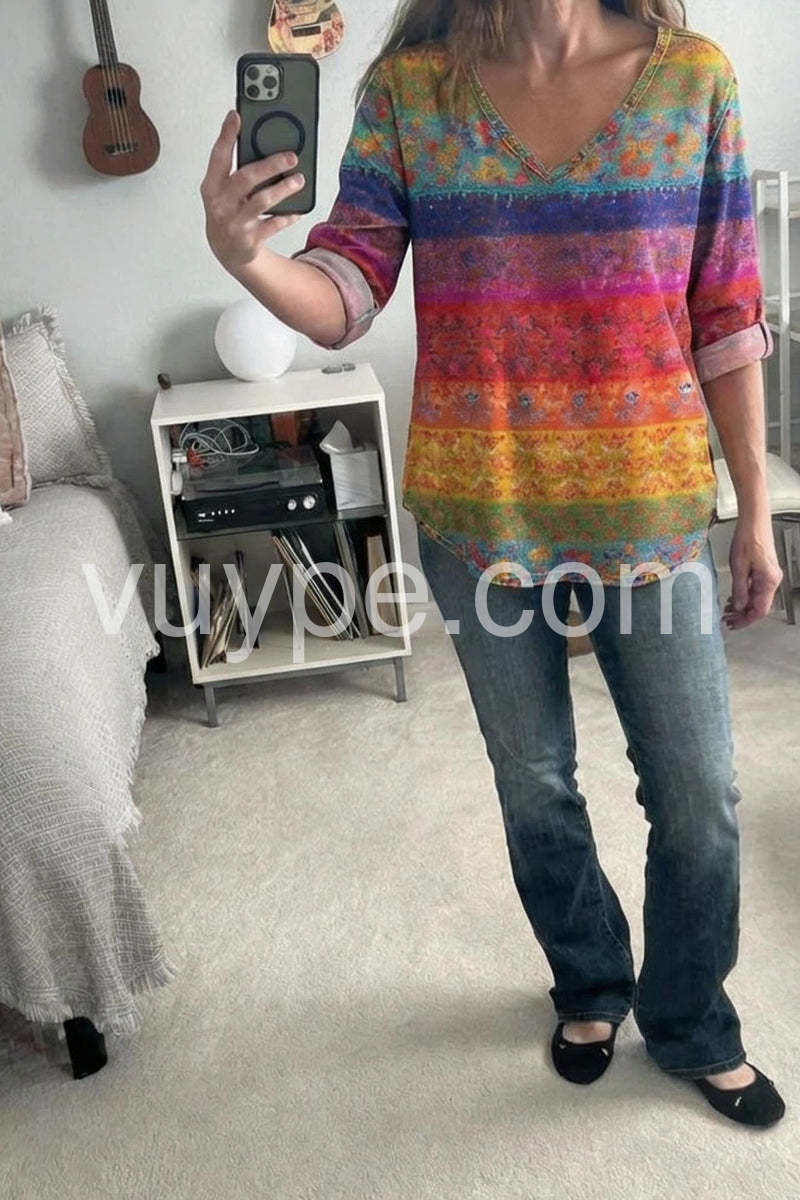 Step into a world of color and culture with this Vibrant Boho Print Multicolor Top, a bold and artistic piece that celebrates global inspiration with every stitch. Crafted from soft, lightweight fabric—likely cotton or rayon blend—this tunic features a stunning horizontal stripe pattern in rich hues of purple, magenta, orange, yellow, teal, and green, each adorned with intricate floral and tribal motifs reminiscent of traditional Mexican or South Asian textiles. The deep V-neckline adds a touch of elegance and femininity, while the relaxed, oversized silhouette drapes beautifully for ultimate comfort. Three-quarter sleeves with rolled cuffs enhance its laid-back charm, making it perfect for pairing with jeans, leggings, or flowy pants.