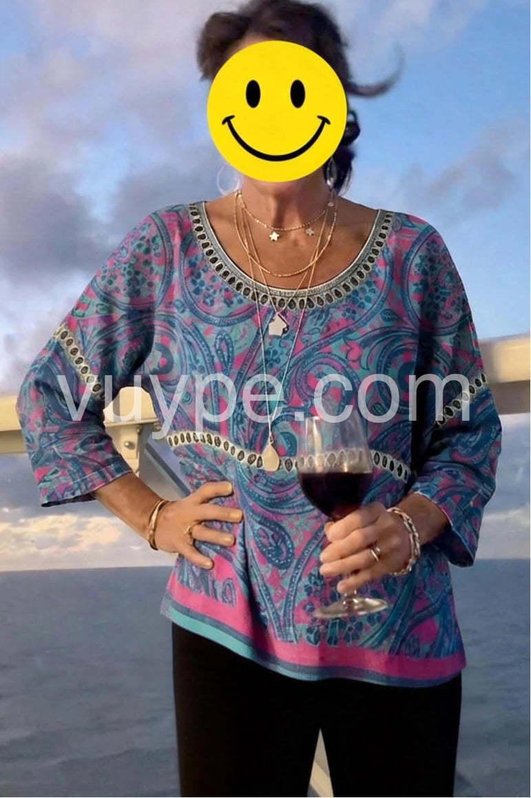Embrace free-spirited fashion with this Special Paisley Print Round Neck Top, a bold and artistic statement piece that brings vibrant energy to any outfit. Crafted from soft, lightweight fabric—likely cotton or rayon blend—this relaxed-fit tunic features an eye-catching paisley pattern in rich shades of deep purple, teal, and fuchsia, accented with intricate tribal-inspired motifs. The design is elevated by delicate black circular trim along the neckline, sleeves, and waistband, adding a touch of bohemian flair and contrast. With its three-quarter sleeves and slightly asymmetrical hem, this top drapes beautifully over jeans, leggings, or skirts, making it perfect for casual outings, music festivals, or weekend adventures. Layer it with layered necklaces, bracelets, and sandals for a full-on boho look—just like in this Lulus-inspired ensemble. Ideal for those who love expressive prints and effortless style, this tunic combines comfort, color, and cultural artistry into one wearable masterpiece. A must-have for anyone craving a touch of wanderlust in their wardrobe.