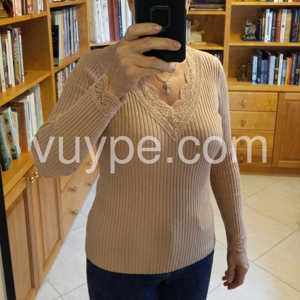 This elegant ribbed knit top in soft brown features delicate lace trim, combining textured comfort with a refined, feminine touch. Its form-fitting silhouette enhances natural curves, while the breathable fabric ensures all-day wearability. Perfect for layering or as a standout piece, it seamlessly transitions from casual to sophisticated looks.