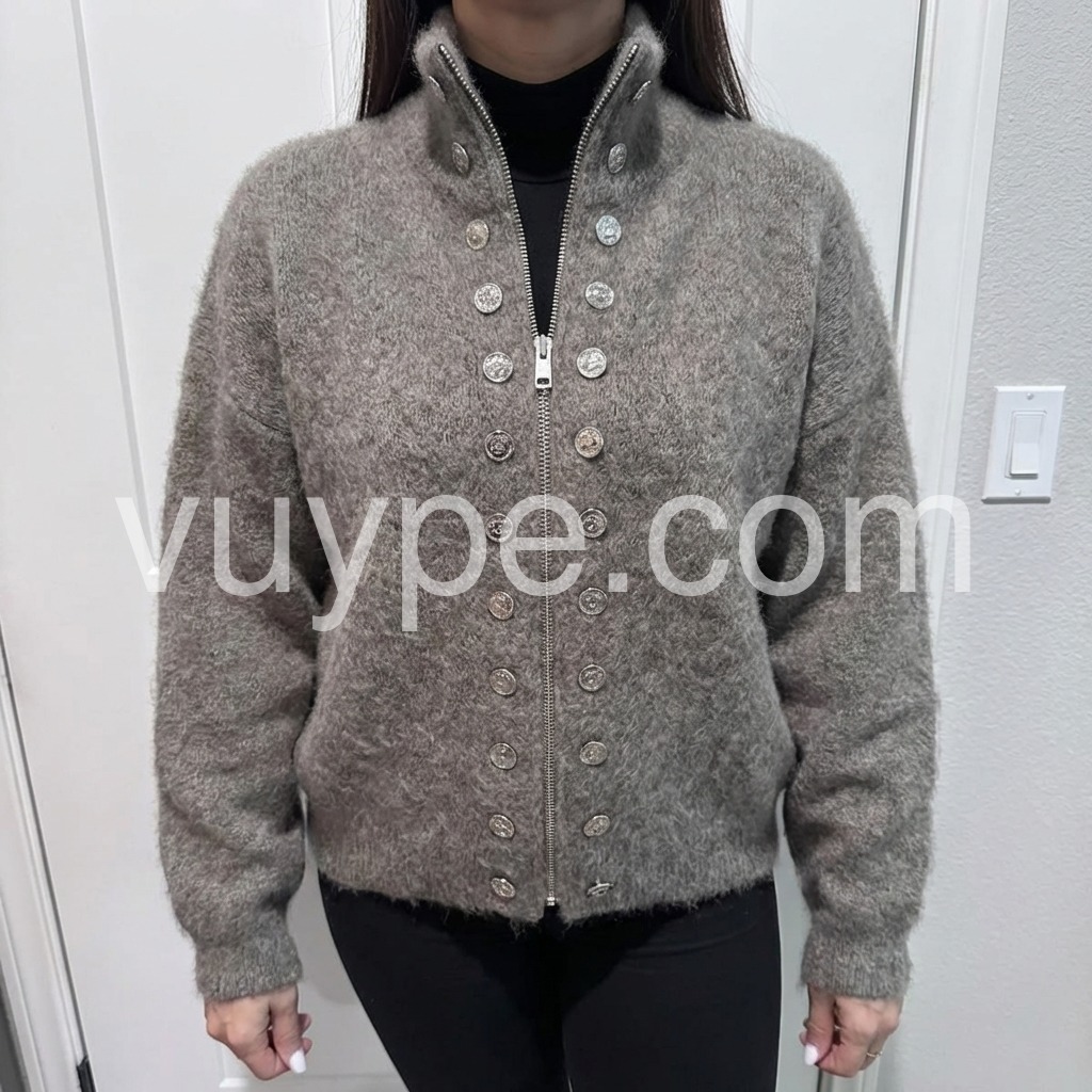 The Fuzzy Grey High Neck Long Sleeve Cardigan is a cozy and stylish addition to any wardrobe. Made with a high neck and long sleeves, it provides warmth and comfort during colder months. The fuzzy texture adds a touch of softness and style, making it a versatile piece for any outfit.