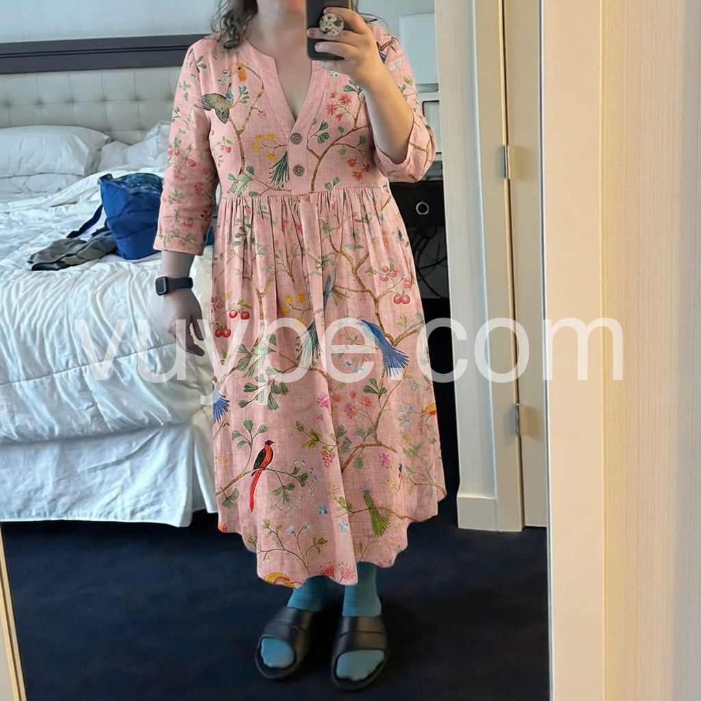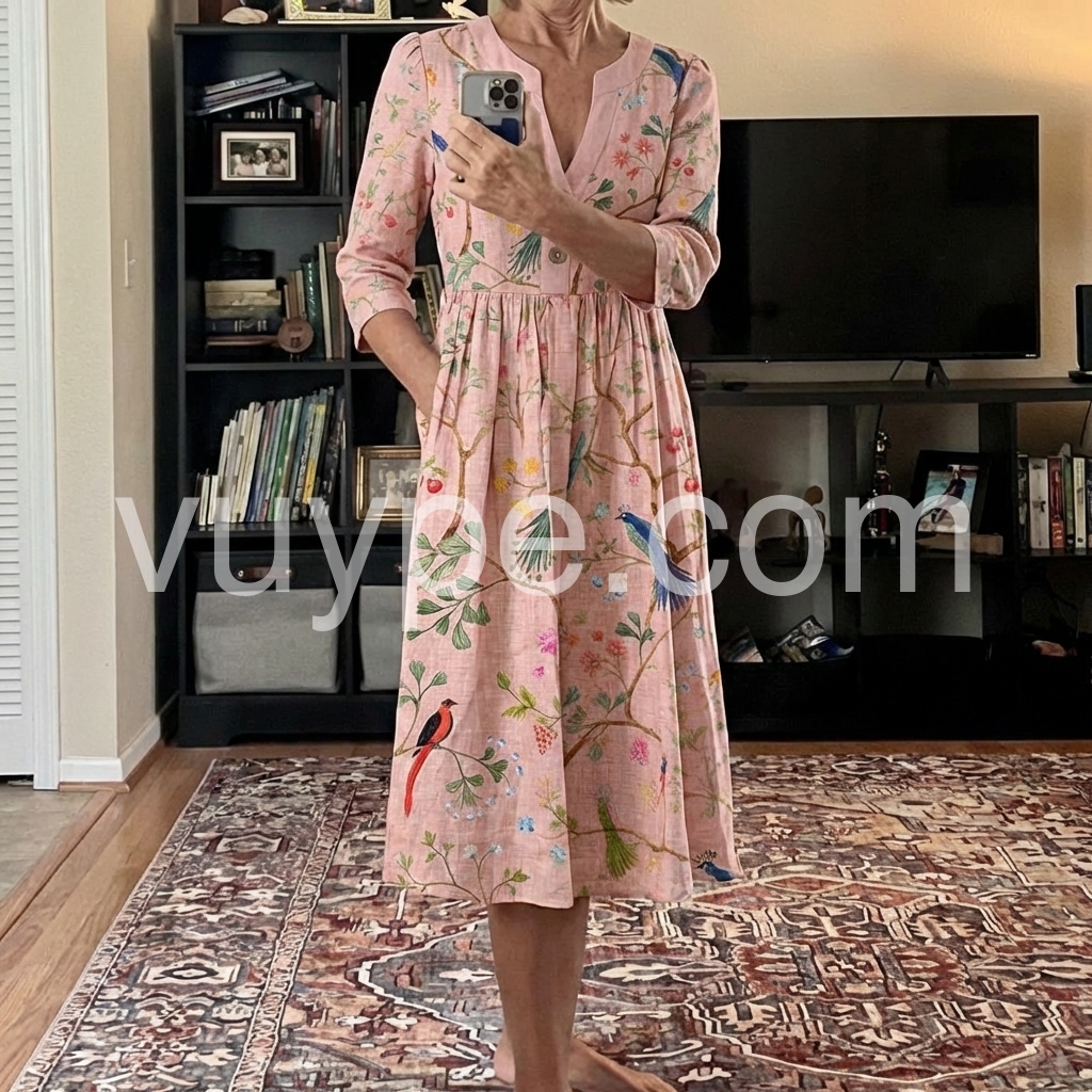 This three-quarter sleeve dress features a soft pink base with colorful birds and floral patterns. The V-neck and button front add vintage appeal. Side pockets offer comfort and convenience. Lightweight fabric perfect for spring and summer. Ideal for casual outings or garden parties.
