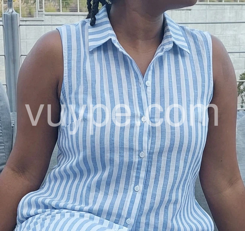 This striped sleeveless shirt dress features a classic blue and white vertical pattern with a relaxed, effortless fit. The collared neckline and front button closure add a polished touch, while the asymmetrical hem offers a modern twist. Lightweight and breathable, it’s perfect for casual summer days. Ideal for beach outings, brunches, or laid-back errands. Pair with sandals or sneakers for a fresh, coastal look.