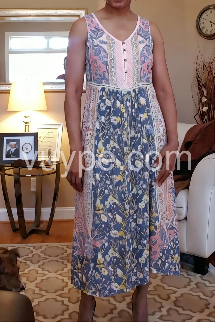 This sleeveless midi dress features a vibrant blue floral print with delicate embroidery details. The V-neck and button-down front add a touch of charm. Lightweight fabric perfect for summer days. Ideal for beach outings or casual events. Effortlessly stylish with a bohemian flair.