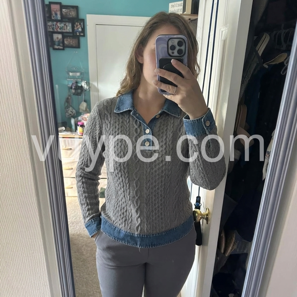 Grey Denim Collar Cable Long Sleeve Sweater