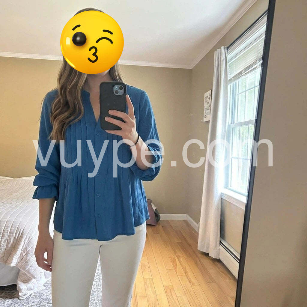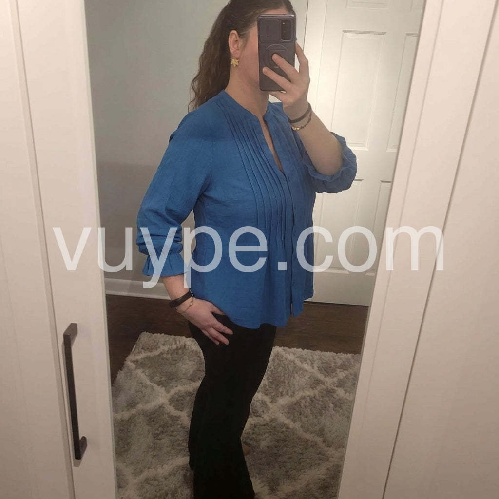 Discover timeless sophistication in this Deep Blue Pleated Button Down Blouse, a beautifully designed top that combines comfort, structure, and feminine flair. Crafted from lightweight, breathable fabric—likely a cotton or linen blend—this long-sleeve blouse features a rich sapphire blue hue that exudes confidence and style. The front is adorned with vertical pleats that add dimension and elegance, while the deep V-neckline offers a flattering touch of allure. A row of matching buttons runs down the center, enhancing the clean, tailored look. The sleeves are finished with gathered cuffs that create a soft ruffle effect when rolled up, adding subtle charm to the silhouette. The peplum hem gently flares out, creating a balanced, hourglass-inspired shape that pairs perfectly with high-waisted pants, skirts, or jeans. Ideal for casual outings, office wear, or weekend brunches, this blouse effortlessly transitions from day to night. Inspired by the curated, minimalist-chic styles found on Lulus.com, it’s a versatile wardrobe essential that brings effortless elegance to any ensemble. A must-have for those who love refined details and classic fashion with a modern twist.