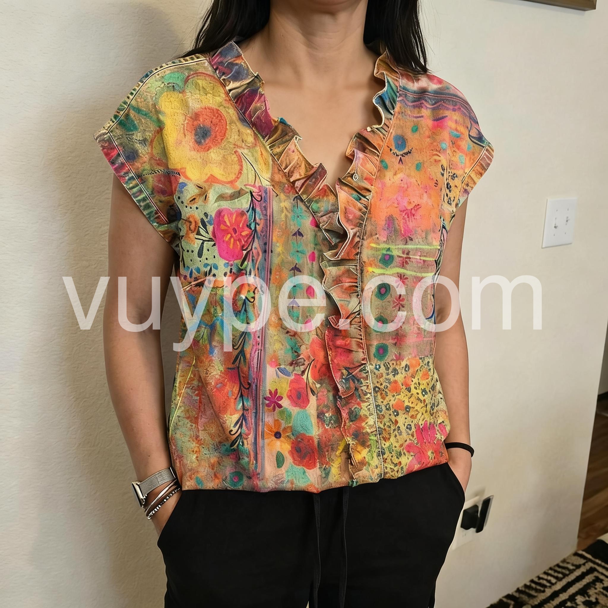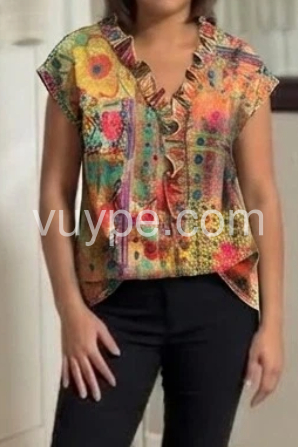 This short Sleeve top features a bold, artistic floral print in warm tones of orange, pink, and green. The ruffled V-neckline adds a playful, feminine touch. Lightweight fabric drapes beautifully for a relaxed fit. Perfect for pairing with jeans or white pants. Effortlessly bohemian and full of summer spirit.