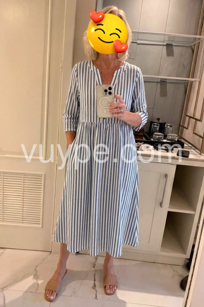 This button-front midi dress features vertical blue and white stripes. The V-neck and three-quarter sleeves offer a classic look. Side pockets add practicality and comfort. Lightweight fabric perfect for summer days. Ideal for beach outings or casual wear.