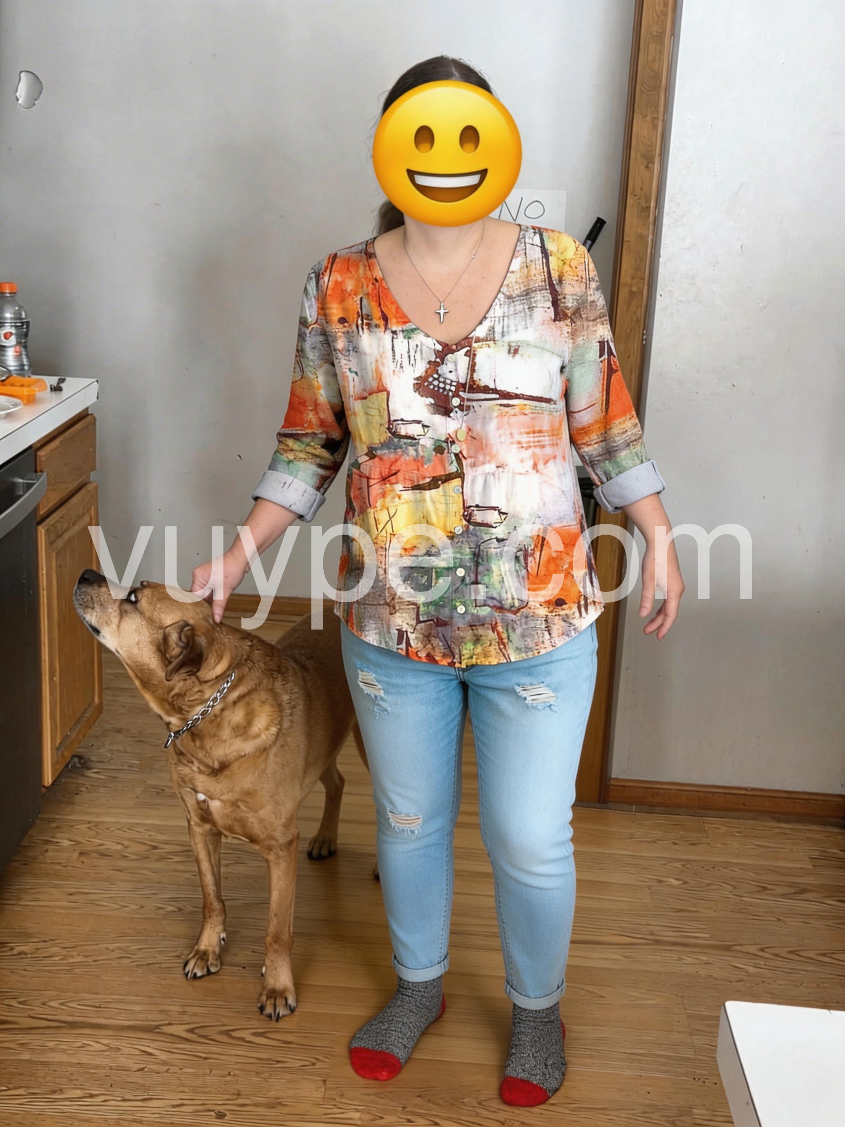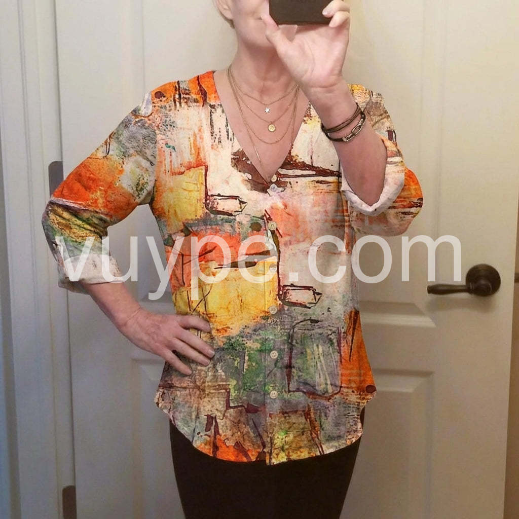 Make a bold fashion statement with this Chic Abstract Watercolor Print Top, a one-of-a-kind top that turns wearable art into everyday elegance. Crafted from soft, lightweight fabric—likely cotton or rayon blend—this blouse features a vibrant, painterly design inspired by watercolor strokes and abstract expressionism. The print blends warm tones of orange, rust, mustard, teal, and cream, creating a dynamic and artistic look that’s both eye-catching and sophisticated. Styled here with distressed denim and layered jewelry, it’s ideal for weekend outings, creative gatherings, or adding a burst of personality to your daily wardrobe. Whether you're heading to brunch or exploring the city, let this abstract-print top elevate your style with creativity, comfort, and boho flair.